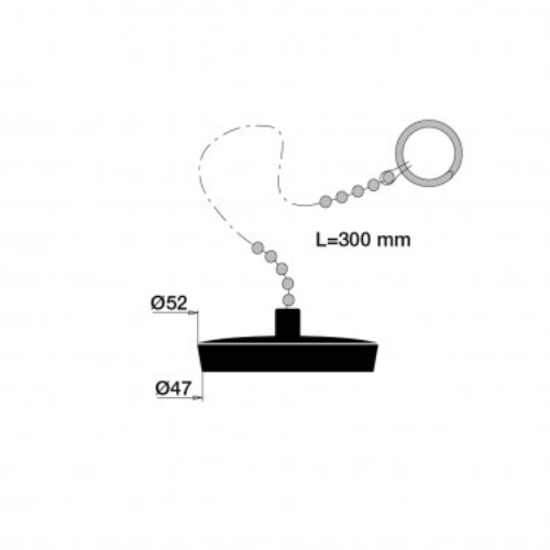 La chaînette mesure 300 mm et le bouchon a un diamètre de 47 mm en bas et 52 mm en haut.