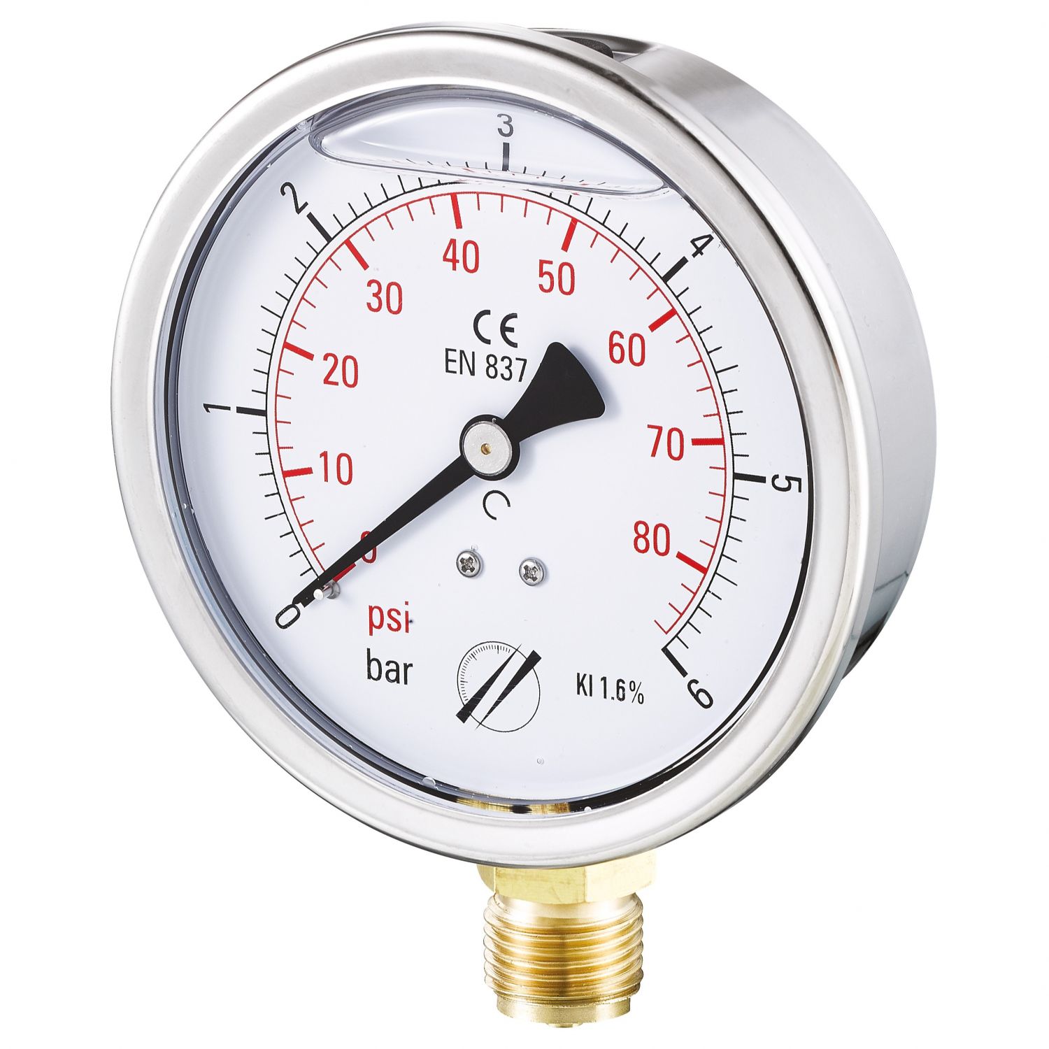 Manomètre glycériné boîtier inox Ø100 raccord vertical 1/2"G
