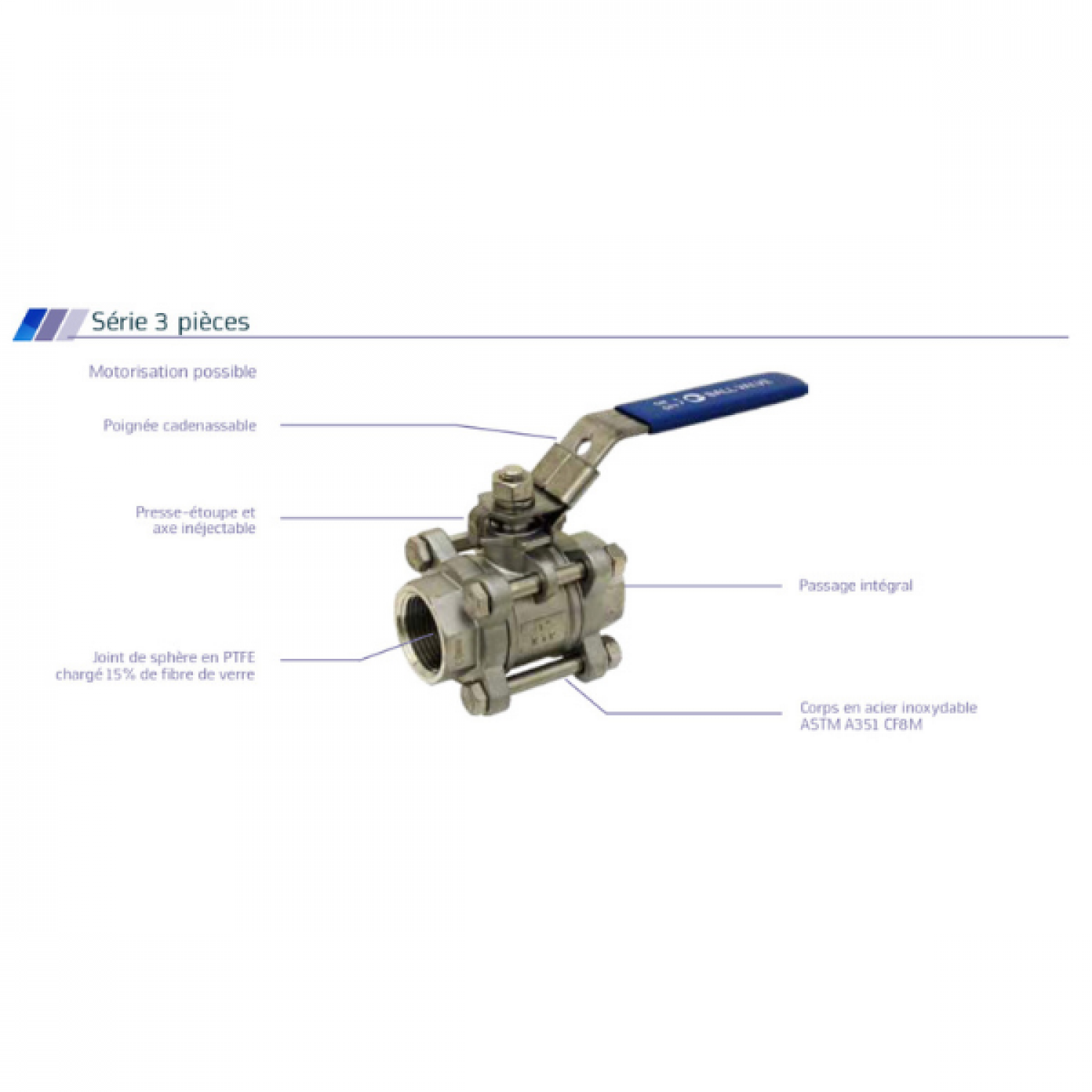 - Corps, sphère et axe en acier inoxydable 316.